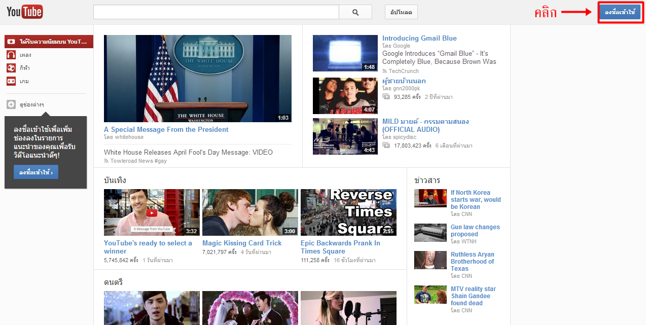 1. ไปเข้าเว็บ http://www.youtube.com แล้วคลิกที่อัพโหลด